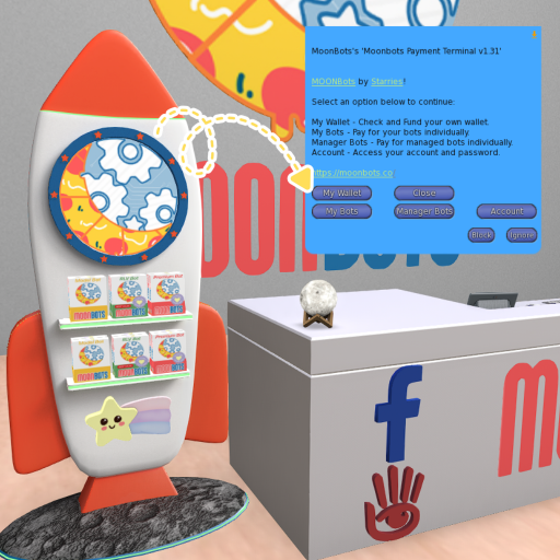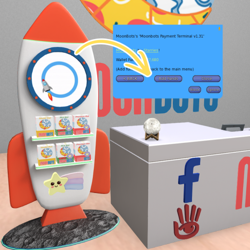 In Second Life, locate our Moonbots Payment Terminal at our office. http://maps.secondlife.com/secondlife/Nuggets/35/146/24