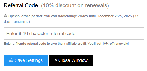 Share your unique referral code with friends, and when they add it to their bots, everyone benefits with 10% off renewals and 10% commission back to you. It's our way of saying thank you for helping grow the community!