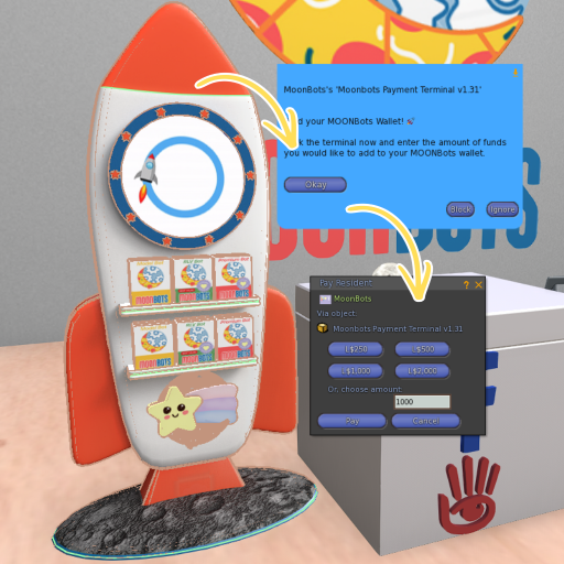 In Second Life, locate our Moonbots Payment Terminal at our office. http://maps.secondlife.com/secondlife/Nuggets/35/146/24